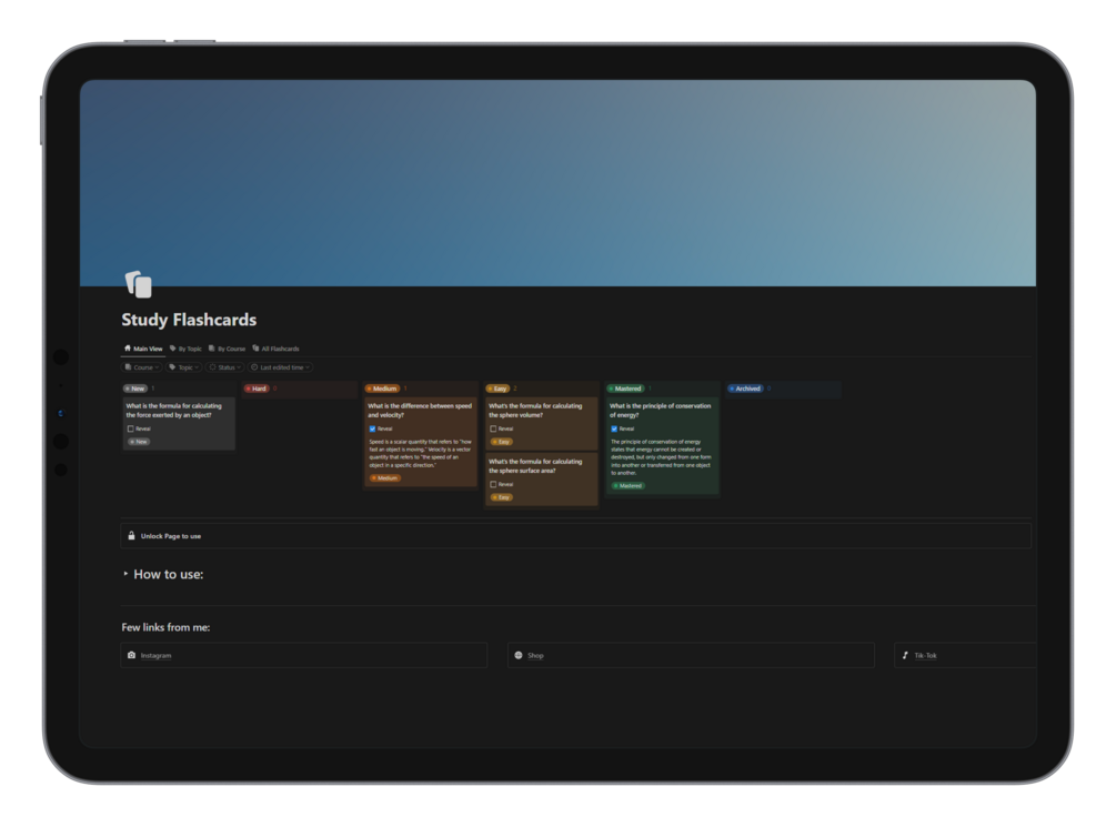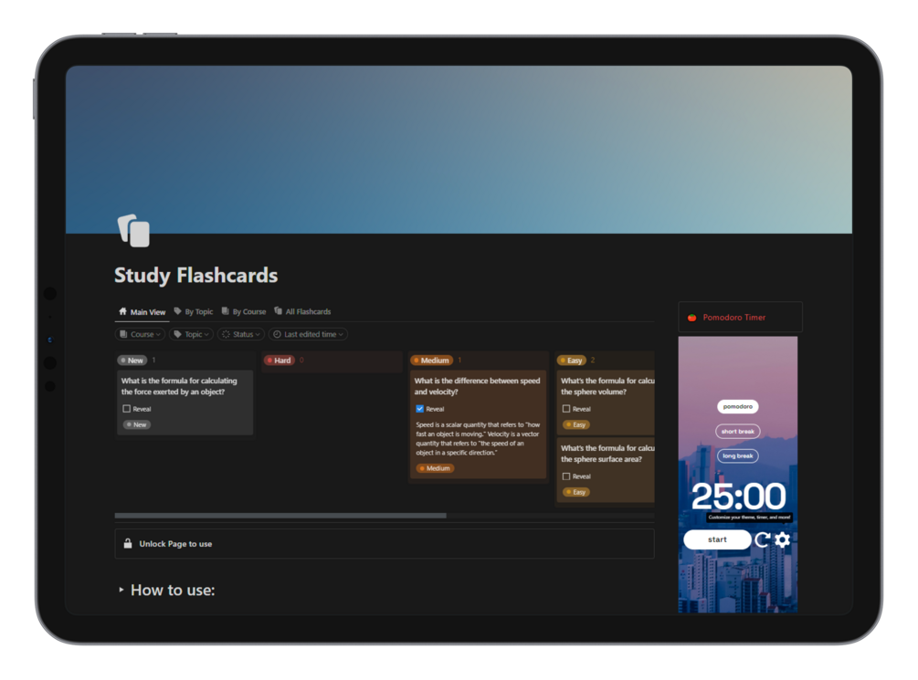 Enhances learning for individuals by facilitating active recall and tracking their learning progress. This include features to categorize their flashcards by course and topic as well as filter them by status, as well as setting a Pomodoro Timer.