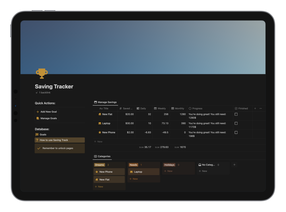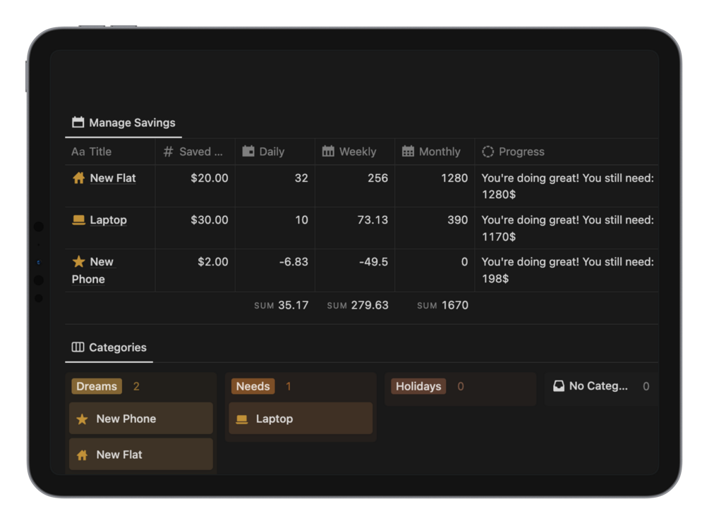 This Notion Template will help you understand how much you have to save for a goals you will set to yourself.